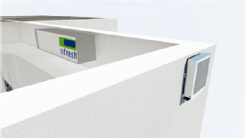 Um einen Kurzschluss zwischen beiden Luftströmen zu vermeiden, ist in der Außenwandhaube ein Luftleitblech angeordnet, das die Fortluft konsequent nach unten drückt.